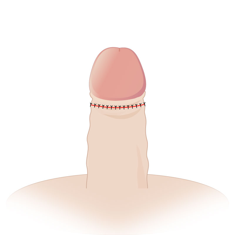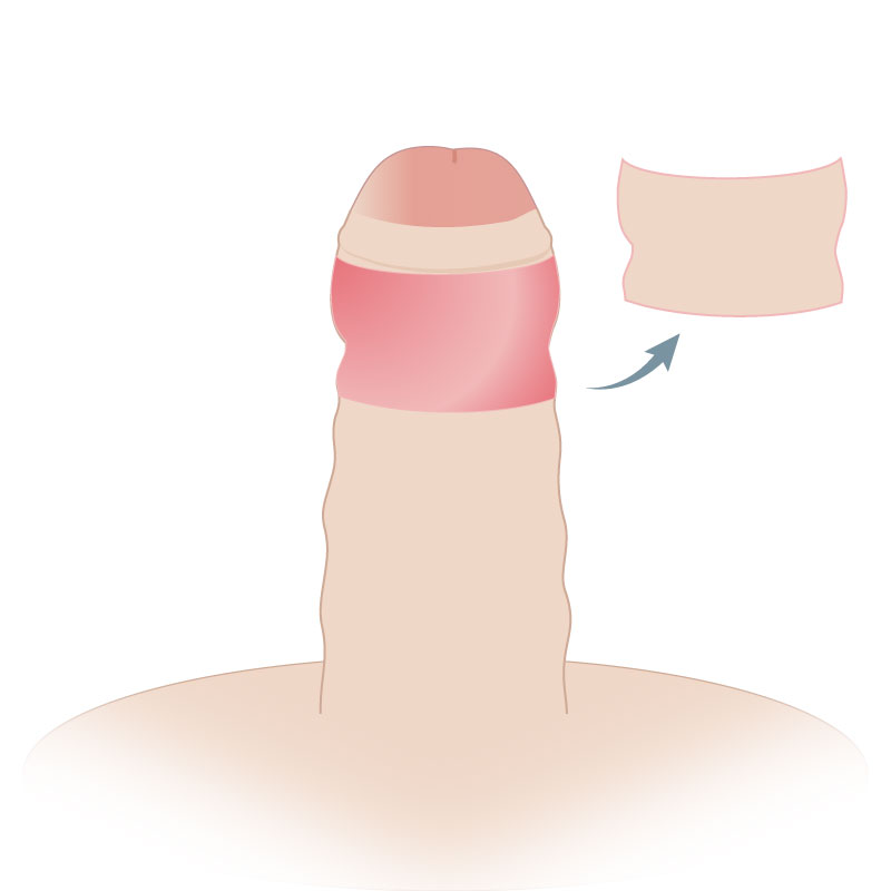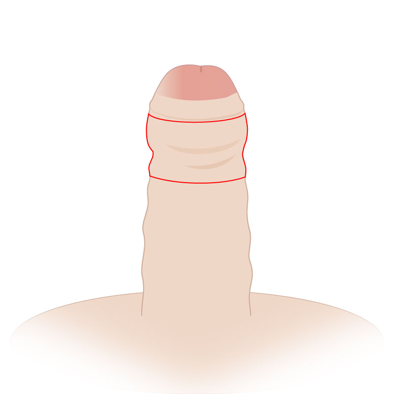 真性包茎(かんとん包茎)は亀頭の下の皮の周径が小さく締め付けられているため、周径が小さい部分で余っている皮を切除する必要があります。